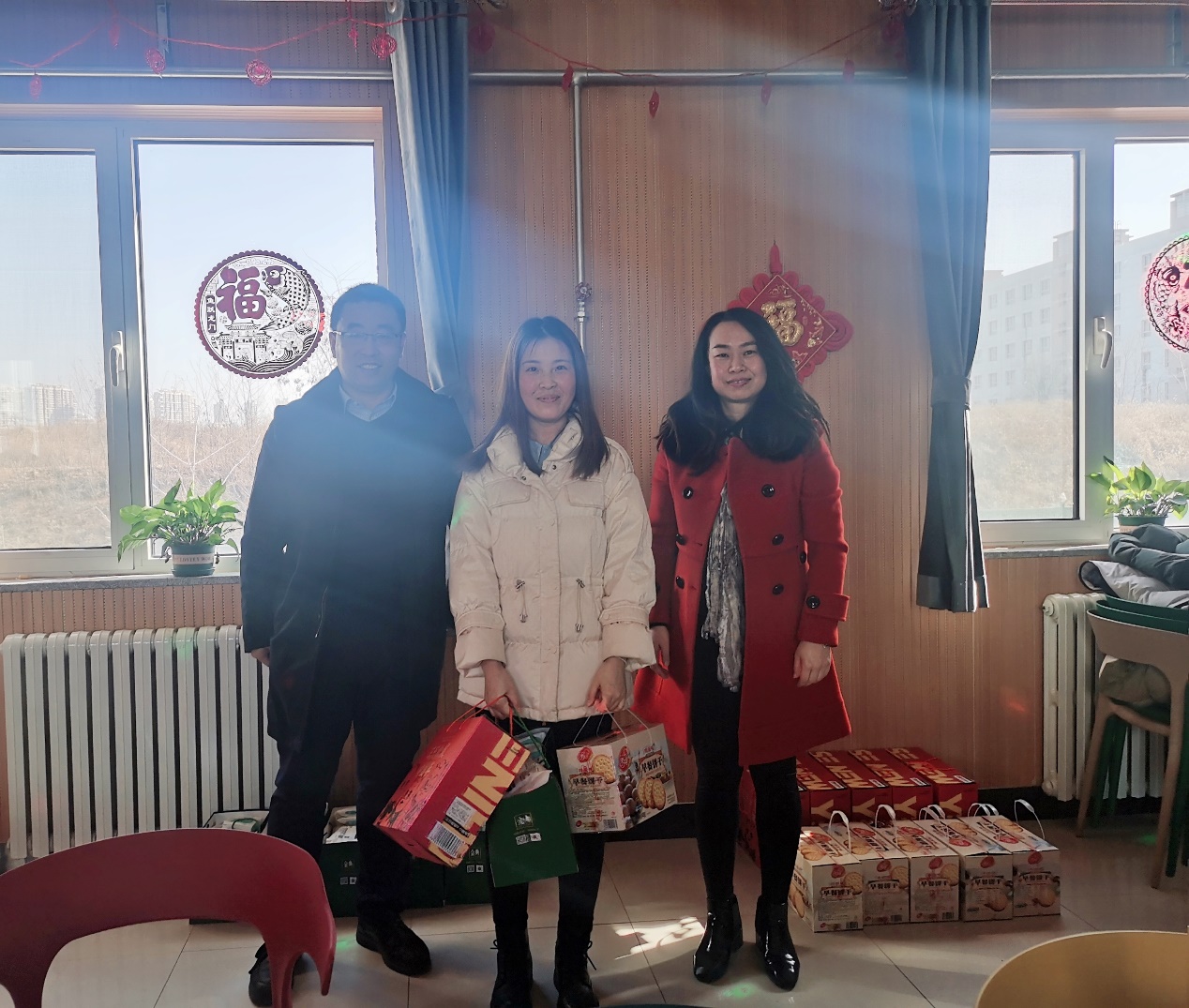 李曦达书记和王利民院长为同学们发放节日慰问礼品和防疫物资