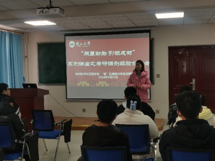 为贯彻落实《高校“一站式”学生社区综合管理模式建设工作指南》,促进学风建设,扎实做好学生的考研精准指导工作,帮助学生积极应对复试挑战,科学合理地准备调剂,材料学院于3月31日在十组团一站式学生社区工作站召开了“朋辈助励·引领成材”系列讲座第五期之考研调剂经验分享会。分享会邀请2023届优秀毕业生黄朝辉进行经验分享,部分2020级考研学生参会并进行了交流,活动由2020级本科生毕业班辅导员范学美主持。