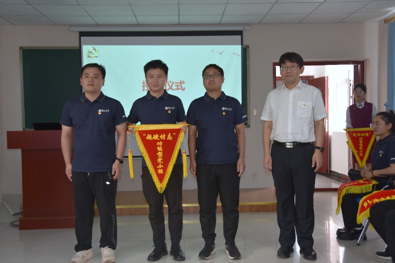 薛传佳依次为五个功能型党小组授旗。党小组代表接过承载着荣誉和责任的旗帜,许下为科技强国不懈奋斗的承诺。