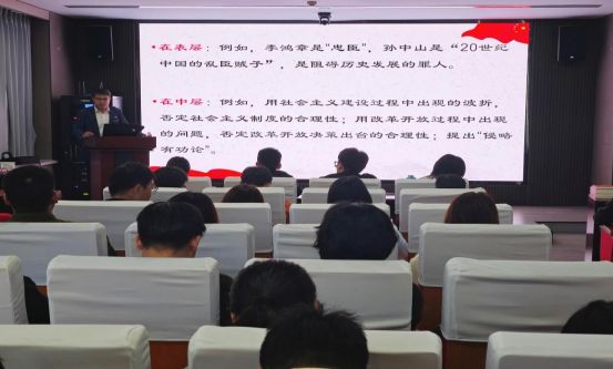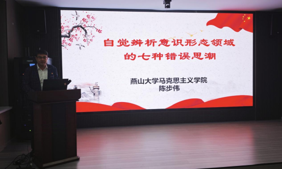 邀请马克思主义学院陈步伟在材料学院新办公楼113会议室以《自觉辨析意识形态领域的七种错误思潮》为主题,为学院16名发展对象和42名学生党员讲授专题党课。