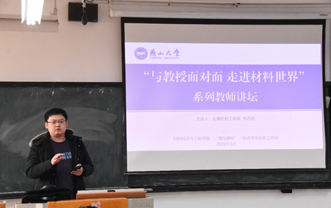 于3月10日举办第十二期“与教授面对面 走进材料世界”系列教师讲坛。本次讲坛特邀学院金属材料工程系主任李艺君担任主讲嘉宾,金属材料工程专业2023级90名本科生全部参与,讲座由辅导员董亮主持。