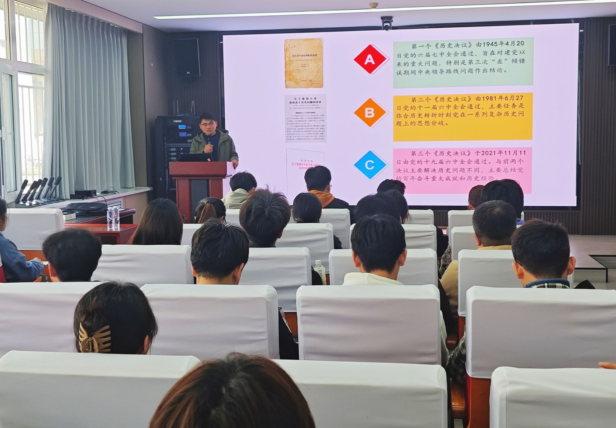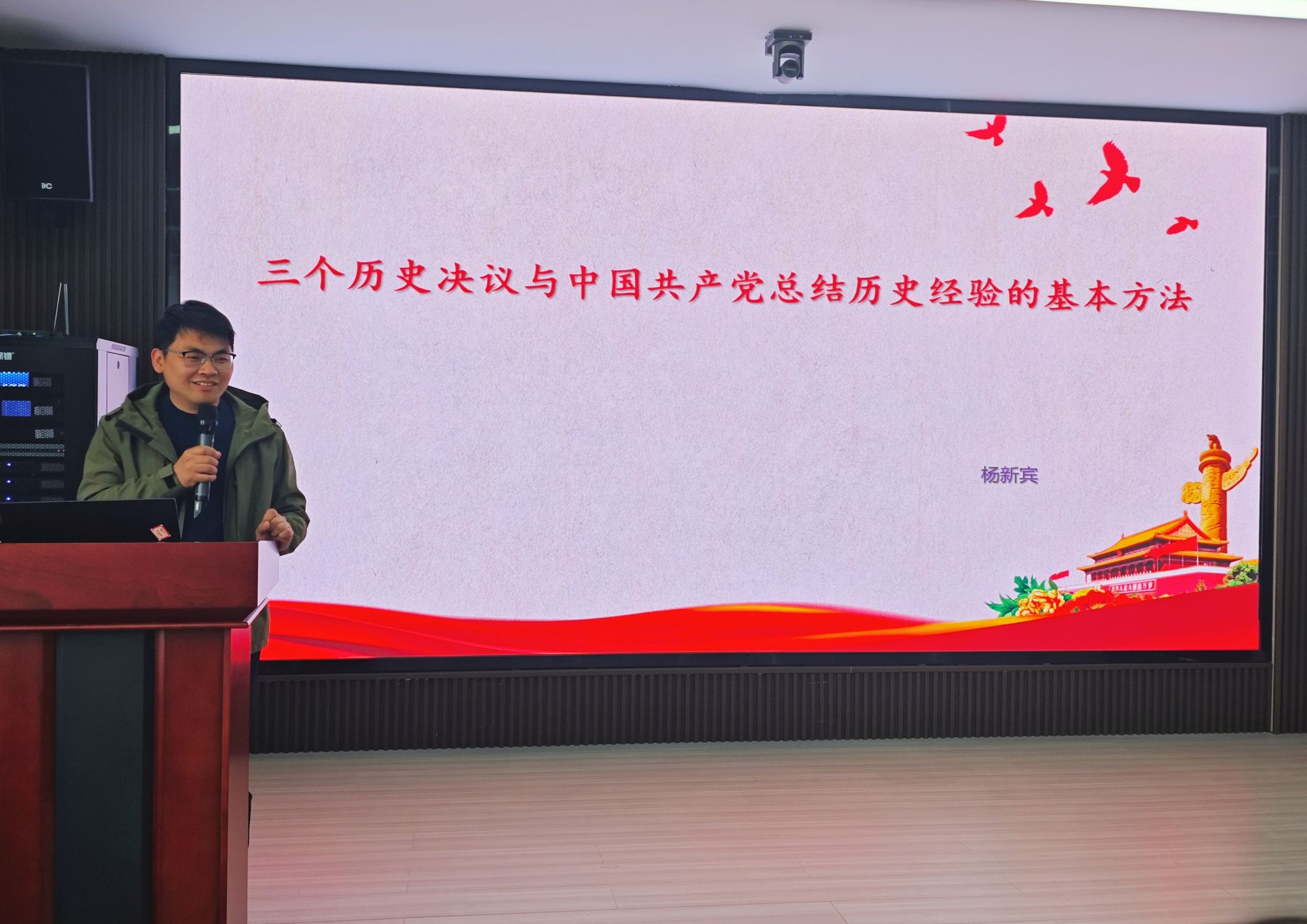 分党校邀请马克思主义学院杨新宾教授在材料学院行政楼113会议室以《三个历史决议与中国共产党总结历史经验的基本方法》为主题,为学院24名发展对象和41名学生党员讲授专题党课。
