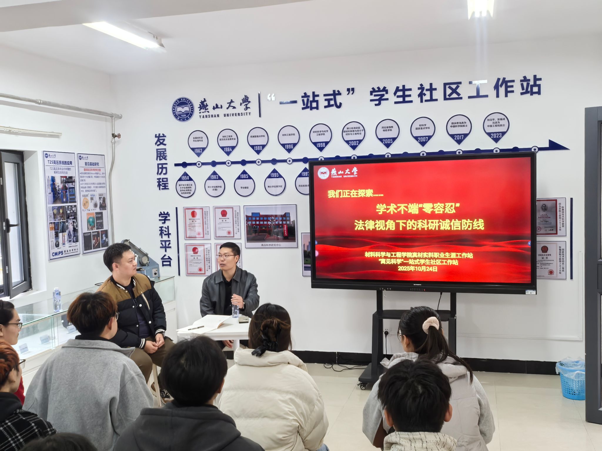 在“寓见科学”一站式学生社区工作站,邀请我院06级金属材料专业校友、河北圣央岚图律师事务所合伙人律师刘瑾,带来“学术不端‘零容忍’:法律视角下的科研诚信防线”主题讲座,用真实案例为大家插接学术诚信密码,学院金属材料工程系系主任李艺君老师主持。