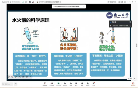 活动当天,线上直播在生动的水火箭科普视频中拉开序幕,瞬间点燃了同学们的好奇心。随后,科普志愿者用通俗易懂的语言拆解水火箭“反作用力推进”的核心原理,搭配生活实例类比,让抽象的力学知识变得直观易懂。