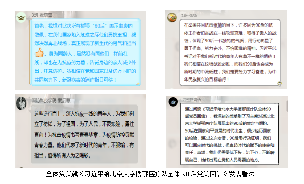 会议内容:全体党员开展“尺笔丹心、‘疫’线先锋”系列主题党日活动,本支部三月份的党日活动的主题是“材料学子战疫情,宅出青春正能量”。会议过程中,全体党员同志学习体会了《习近平给北京大学援鄂医疗队全体90后党员回信》,并从多个角度发表了各自的看法。有的同志表达了对抗疫前线的90后青年党员的敬佩之情和自豪之感;有的同志则认为青年是一个国家的支撑,一个民族的希望,作为90后的青年一代的我们应该奋发图强,担当使命;还有的同志表达了对疫情下的所有医护人员的关心和祝愿。