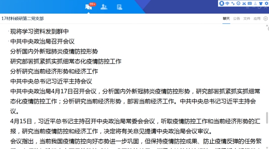 硕士研究生第二党支部于4月20日开展了学习贯彻习近平总书记主持召开的中共中央政治局常委会会议和中共中央政治局召开会议精神的专题学习会,深入了解了国内外新冠肺炎疫情防控形势和当前经济形势,深入学习了疫情防控和当前经济的部署工作。