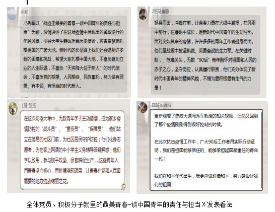 最后,党支书对本次活动进行总结,青春由磨砺而出彩,人生因奋斗而升华,作为90后青年党员,我们应当积极响应党的号召,踊跃投身疫情防控人民战争、总体战、阻击战,不畏艰险、冲锋在前、真情奉献,展现当代中国青年的担当精神,赢得党和人民高度赞誉。同时我们也应当秉承先辈精神,发扬责任意识,勇担起自己应负的责任,不负韶华,振兴国家。