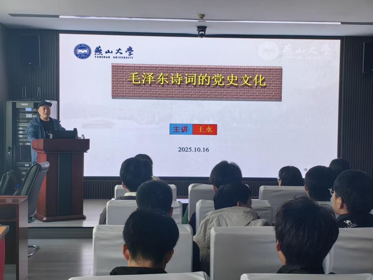 邀请文法学院王永老师在材料学院新办公楼113会议室开展《毛泽东诗词的党史文化》专题党课,学院34名学生党员和30名发展对象参与学习。