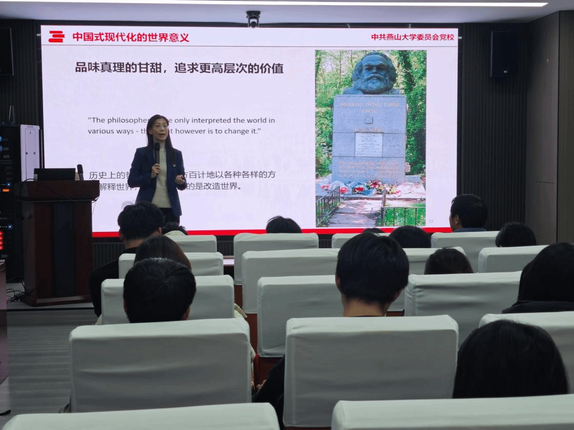 郭清秀从中国式现代化的特征、如何实现中国式现代化、中国式现代化的世界意义三方面深入阐述什么是中国式现代化。中国式现代化是中国共产党领导的社会主义现代化,既有各国现代化的共同特征,更有基于自己国情的中国特色。在坚定维护世界和平与发展中谋求自身发展,又以自身发展更好维护世界和平与发展,推动构建人类命运共同体,是中国式现代化的突出特征。她鼓励同学们在材料科学领域攻坚“卡脖子”技术,融入创新驱动发展,在国际交流中分享中国智慧、讲好中国故事。最后郭清秀以马克思墓名言——历史上的哲学家总是千方百计地以各种各样的方式解释世界,然而更重要的是改造世界,勉励全体同学:品味真理的甘甜,追求更好层次的价值。