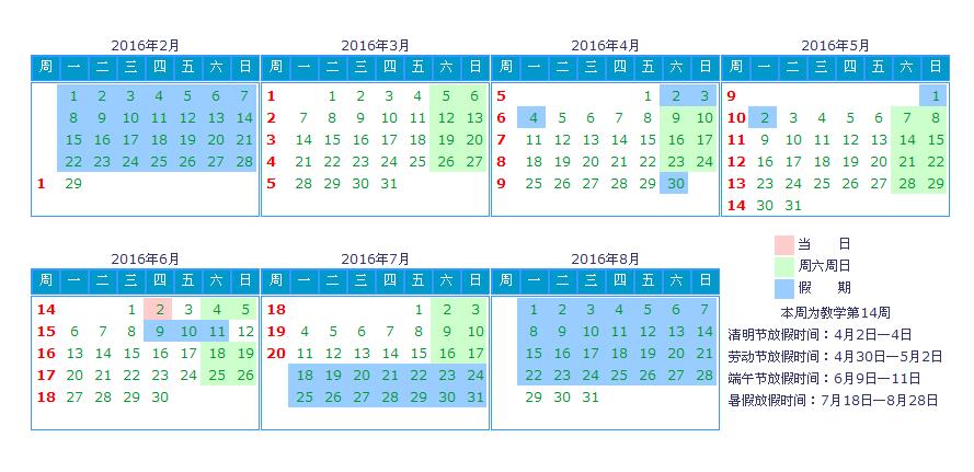 一帆视频 2016年春季学期教学校历